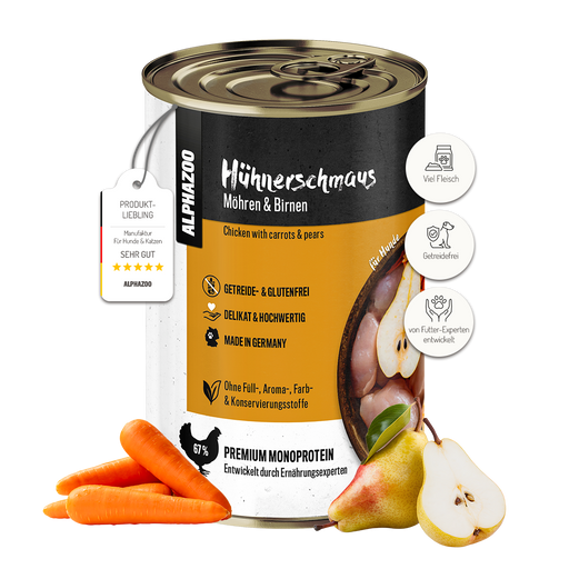 Kycklingmåltid  Skäm bort din hund med Hühnerschmaus – ett förstklassigt våtfoder med endast en proteinkälla, framtaget av experter på hundnäring. ...